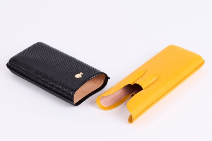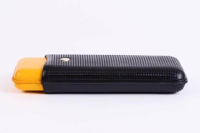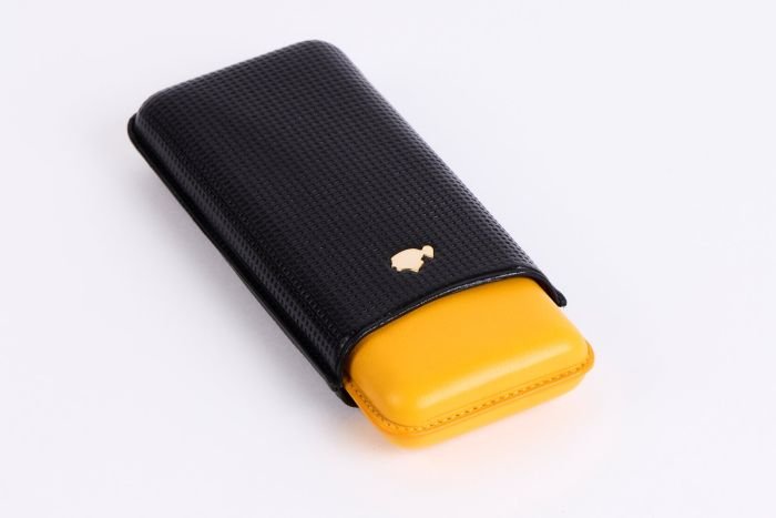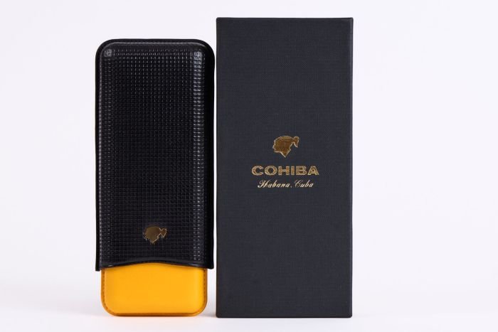 A new leather case from the top Habanos brand COHIBA is now available in stores. It is manufactured in the city of Cádiz in the Spanish region of Ubrique in southern Andalusia, which is world-famous for its long tradition in leather craft. This is also where the El Petaquero company is based, where this case is made by hand. The upper part is covered with embossed, black beef liver, on the upper side is the brand-typical Taino head made of shiny gold metal. The lower part with yellow leather is decorated with a lettering of the brand COHIBA embossed into the leather. The neatly crafted case offers space for two cigars with ring gauge 52 and one cigar with ring gauge 54 (in the middle). The case is variable in length and can therefore also accommodate longer formats, such as the Julieta No.2 (which is also popularly known as “Churchill”). The case is packed in a high-quality box made of sturdy cardboard in the colors and with the gold-embossed COHIBA logo. It is therefore certainly very suitable as a special gift for discerning aficionados.
