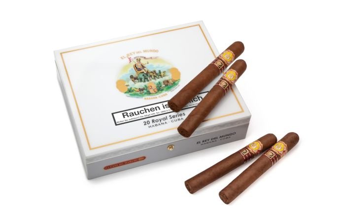 El Rey del Mundo Royal Series is offered in massive and very elaborately crafted boxes containing 20 pieces. The cigars are in the “Doble” format, with a length of 155 mm and a ring gauge of 50.
