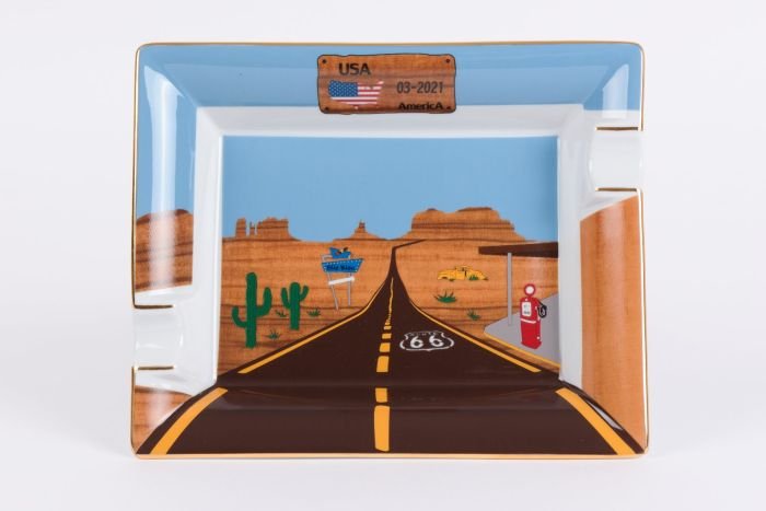 Product characteristics: Ashtray in Limoges porcelain, “Route 66” design. The base is alcantara coated. The decoration is applied by chromolithography The ashtray is made in France Product Size: Length: 19.8 cm | 7.75 inch Width: 16.1 cm | 6.33 inch Height: 3.6 cm | 1.41 inch