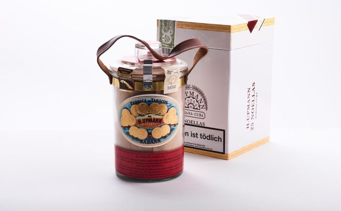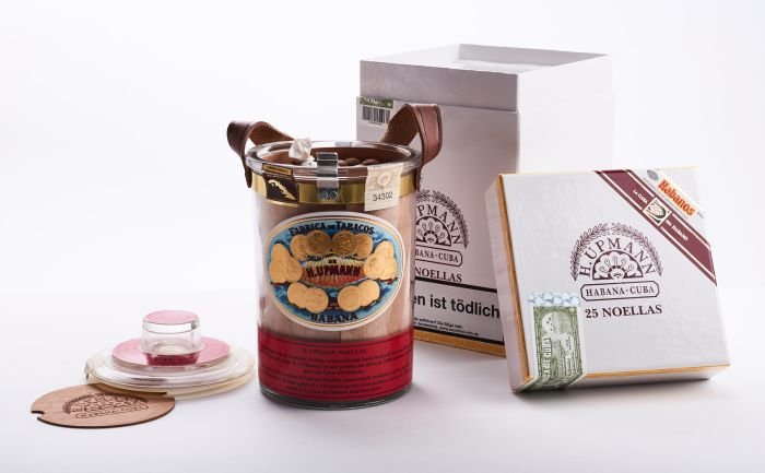 The glass jars of the H.Upmann Noellas contain each 25 of these cigars in the Cosacos format (135 mm length, band size 42). These jars were produced by the Cuban cigar industry up to the beginning of the 1980s and then discontinued. The jars were famous for the very special maturation storage capacity of these light to medium strength cigars. In the “Illustrated encyclopaedia of post-revolution Havanna cigars” by Min Ron Nee, there is the following note: “Older specimens have a very fine and delicate bouquet, just like a large Burgundy just as ripened. The less these cigars are disturbed in the glass jar…, the better the bouquet is developed. This cigar is regarded as classical example for the fact that cigars locked in an air tight environment undergo a ripening process which can be compared to “wine in the bottle”.