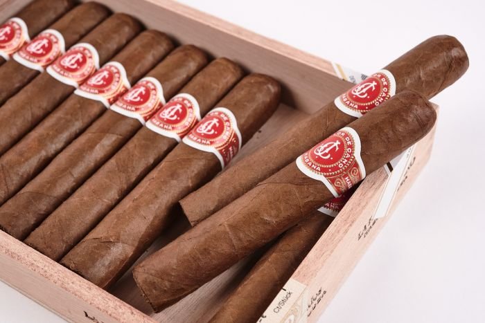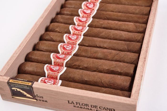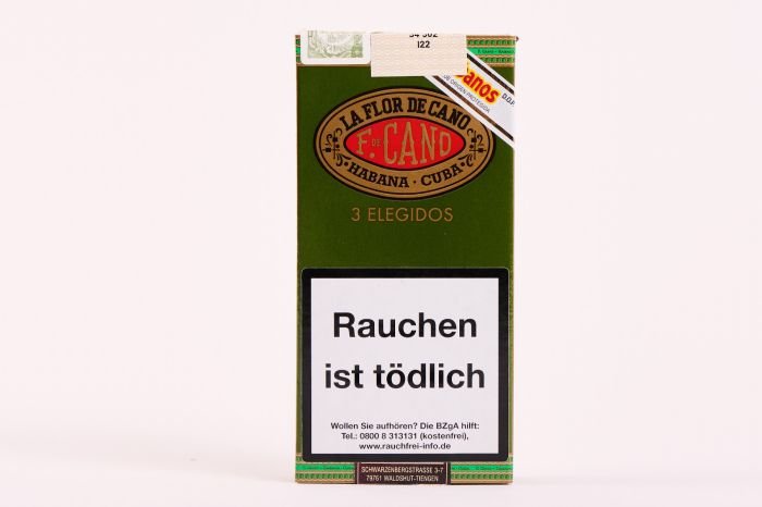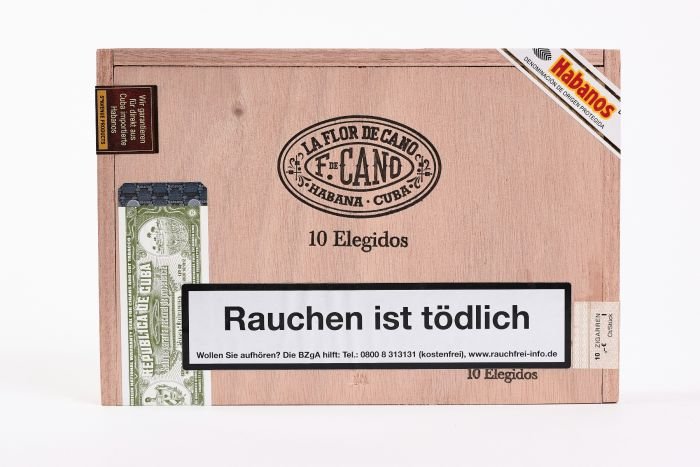 For 2020 Habanos presented a new vitola from the “La Flor de Cano” brand: the Elegidos. By the way, the self-confident name means “The Chosen One” in German. It has a specially created format called “Lirios”. It is 127 mm long and has a typical Robusto ring gauge of 50. The mixture of Elegidos is medium-strong and offers the brand-typical balance between taste and aroma. The La Flor de Cano Elegidos are sold in unpainted wooden boxes of 10 pieces and in cardboard boxes of 3 pieces. They are made as a completely hand-made short filler – totalmente a mano, tripa corta.
