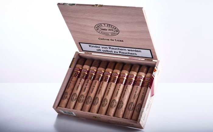 With the Romeo y Julieta Cedros de Luxe, Habanos S.A. now presents a new cigar format which is exclusively available in the worldwide 147 shops of La Casa del Habano. The format of the Cedros de Luxe is “Gordito” (length 140 mm x band size 50) and has formerly only been existing in the brand San Cristóbal as the popular format “La Fuerza”. The elegant and aromatic tobacco blend of the Romeo y Julieta Cedros de Luxe consists of the best tobaccos of the Vuelta Abajo, and promises more than one hour of the finest cigar enjoyment. A second cigar band designates it as being intended to be exclusively sold in the La Casas del Habano. Every year only a certain quantity of these cigars are manufactured, which are highly popular not the least for this reason with aficionados and collectors. The Romeo y Julieta Cedros de Luxe comes in half natural boxes with 10 cigars into the shops of La Casa del Habano.