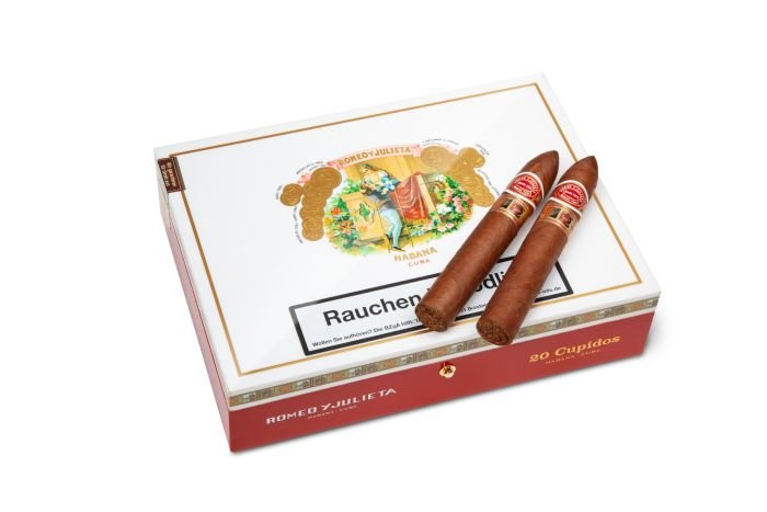 Romeo y Julieta Cupidos is a new cigar format developed by Habanos S.A. offered exclusively for the shops of La Casas del Habano and Habanos Specialists. A completely new figurado format with a large ring gauge of 55 was developed for this cigar. The production name (Vitola de Galera) of the 148 mm long Habano is “Veronas”, a nod to the famous tragedy by William Shakespeare that gave the brand its name. This also applies to the name of the format: “Cupidos” is the Spanish word for the god of love in Roman mythology.