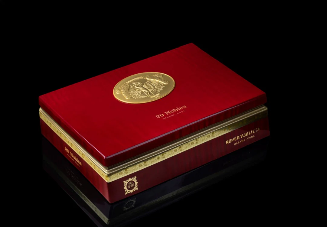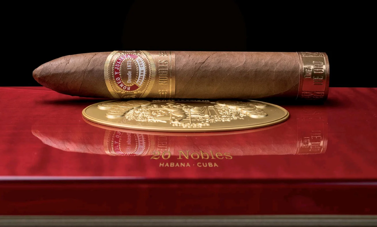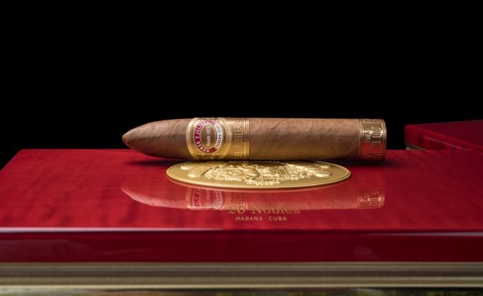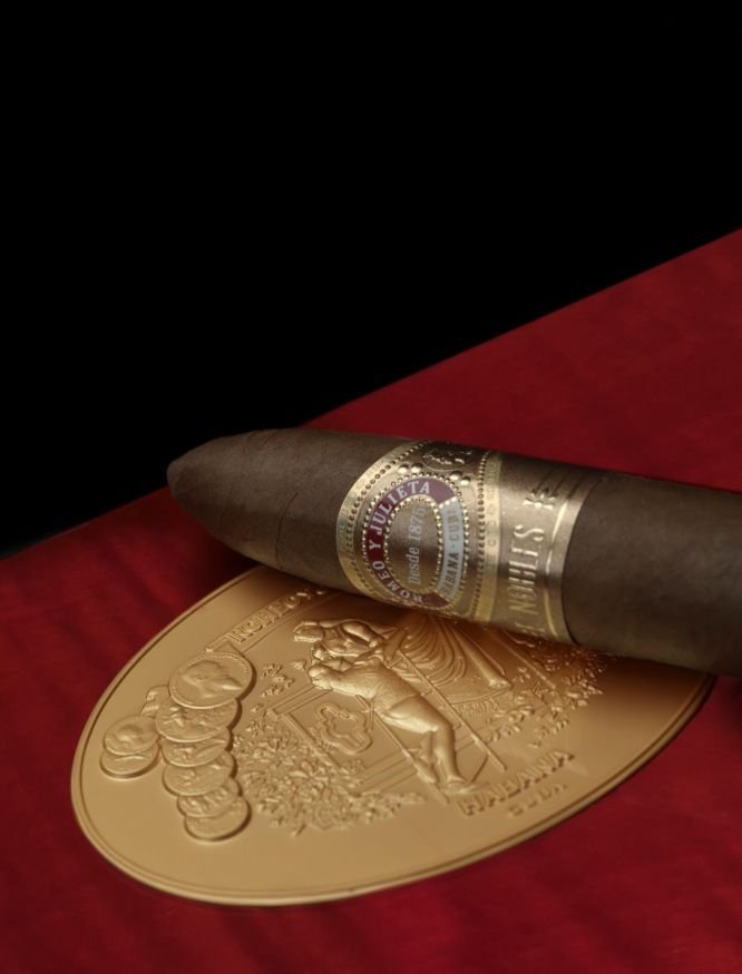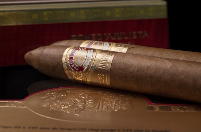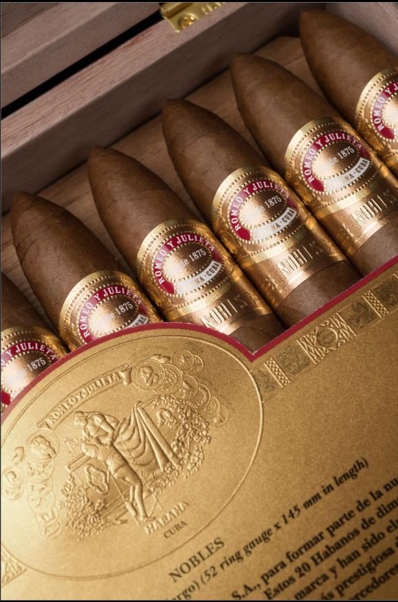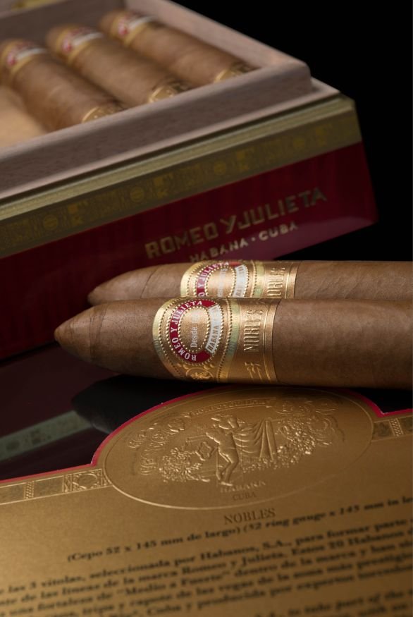 Línea de Oro “is the name of Habanos S.A. the new super premium line of the Habanos brand Romeo y Julieta, founded in 1875. Since “Oro” means “gold” in Spanish, this new series has some to expect. SHE WILL continue to add to the brand’s range on a permanent basis and consists of three new, current formats that are exclusively reserved for this series. The Nobles, a new figurine format with the production designation “Triangulares” with a length of 135 mm and a large ring gauge of 56. All three new formats follow the trend towards cigars with large ring sizes and medium length. Your tobacco blend is described as medium to strong, which is a novelty for the Romeo y Julieta brand, which was recently known as medium-strength, and its spectrum is also expanded in terms of taste. The three new cigars come on the market in elaborately made and very eye-catching boxes of 20 each. They are lacquered with a high gloss in a warm reddish brown. Die Vista from Romeo y Julieta with the classic balcony scene as a medallion can be found on the lid. The edges of the lid and the lower part are set off in gold. The cigars are covered by an embossed bofeton with information about the “Línea de Oro”. The cigars are adorned with a new ring that is used exclusively for the “Línea de Oro”. Its color design, according to the name of the line, is also made of gold and bears the name of the respective cigar format. A second ring at the base of the cigars indicates that it belongs to the “Línea de Oro”. For a new Habanos line in this category, it goes without saying that the cigars are made from the best tobaccos of the Vuelta Abajo “totalmente a mano” – entirely by hand – as long fillers.