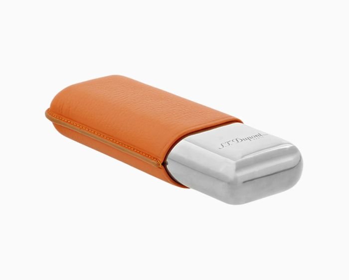 The perfect connection between the iconic style of S.T. Dupont and the color pop orange. Light, soft, grained cowhide leather in harmony with stainless steel. This fine accessory is used to store and protect up to two standard format cigars.