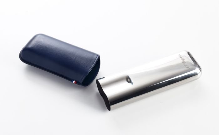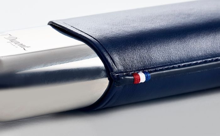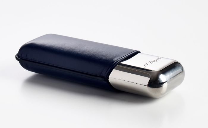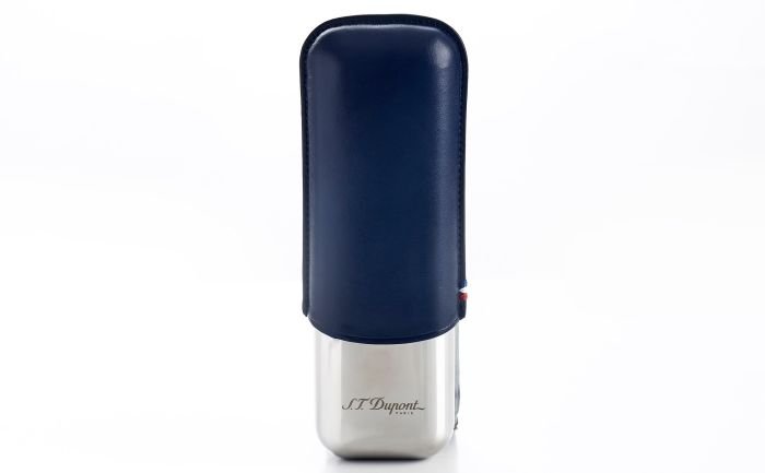 Case for two cigars made of smooth blue cowhide and stainless steel with S.T. Dupont engraving and unmistakable seam in blue, white and red. Dimensions: 18x6x3cm Weight: 0.130kg