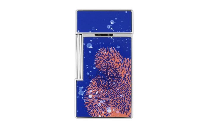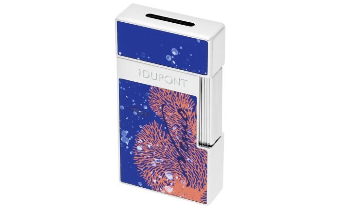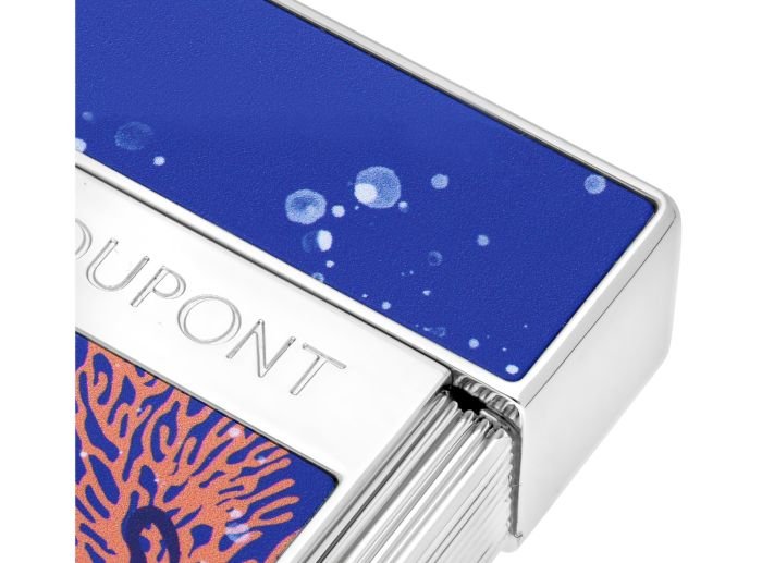A tribute to the captivating world of 20,000 Leagues Under the Sea, this limited edition brings to life the expertise of S.T. Dupont. The novel, published in 1870, recounts the journey of three shipwrecked sailors captured by Captain Nemo, the mysterious inventor who sails the depths of the sea on the Nautilus, an underwater world far ahead of the technologies of the time. Portholes, turbines, corals, fins, and other tentacles of gigantic squid inspired this limited edition, featuring three series, each linked to different chapters of the book. A three-part story to immerse yourself in with passion. “Vanikoro” takes its name from its motif, “corals.” In the chapter of the same name, Captain Nemo and his three companions land on the island of Vanikoro, surrounded by an incredible coral reef. Biggy lighter in shiny blue lacquer with Vanikoro decoration. Chrome finish. With a 2 cm long blue torch flame, ideal for lighting cigars, candles, or cigarettes. Includes gas refill: black (REF 900430). Lighter comes with empty gas; refill sold separately.
