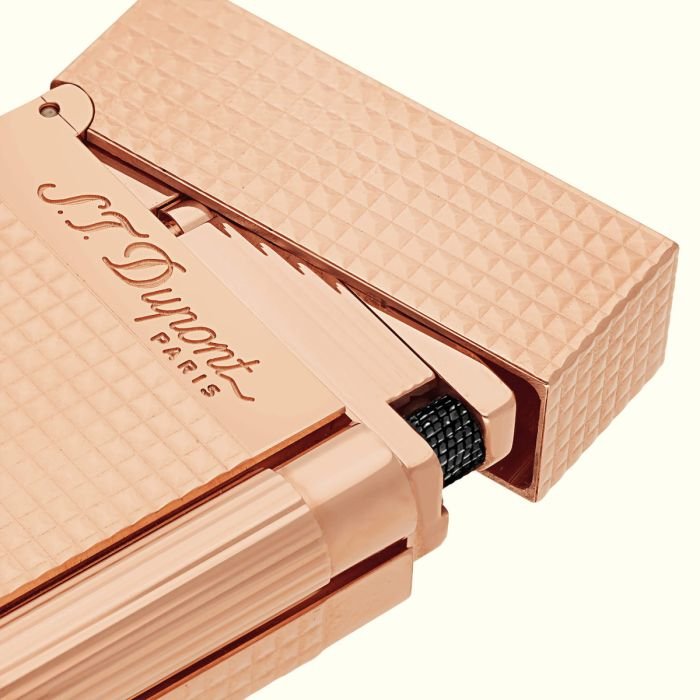 – Luxury lighter from S. T. Dupont Line 2 – Famous “cling” sound – Rose gold plated, Diamond-waffle pattern – Size 62x37x10 mm – Weight 112g – Item Number 16424